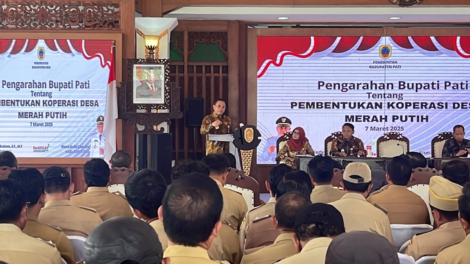 Pati, 7 Maret 2025 – Bupati Pati, Sudewo, memberikan pengarahan kepada seluruh Kepala Desa se-Kabupaten Pati untuk segera membentuk Koperasi Desa Merah Putih. Hal ini disampaikan dalam rapat koordinasi yang digelar pada Jumat (7/3/2025). Pembentukan Koperasi Desa Merah Putih merupakan program pemerintah pusat yang bertujuan untuk mendistribusikan berbagai kebutuhan pokok masyarakat, seperti gas elpiji, sembako, alat-alat pertanian, dan lainnya.