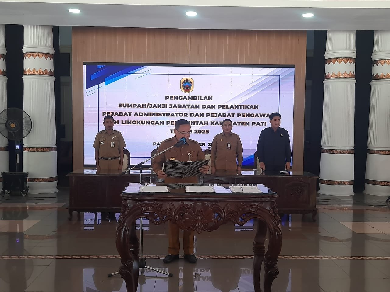“Per tanggal 15 September 2025, saya Bupati Pati secara resmi melantik saudara-saudara sebagai pejabat administrator dan pejabat pengawas di lingkungan Pemkab Pati,” ujar Sudewo dalam sambutannya.