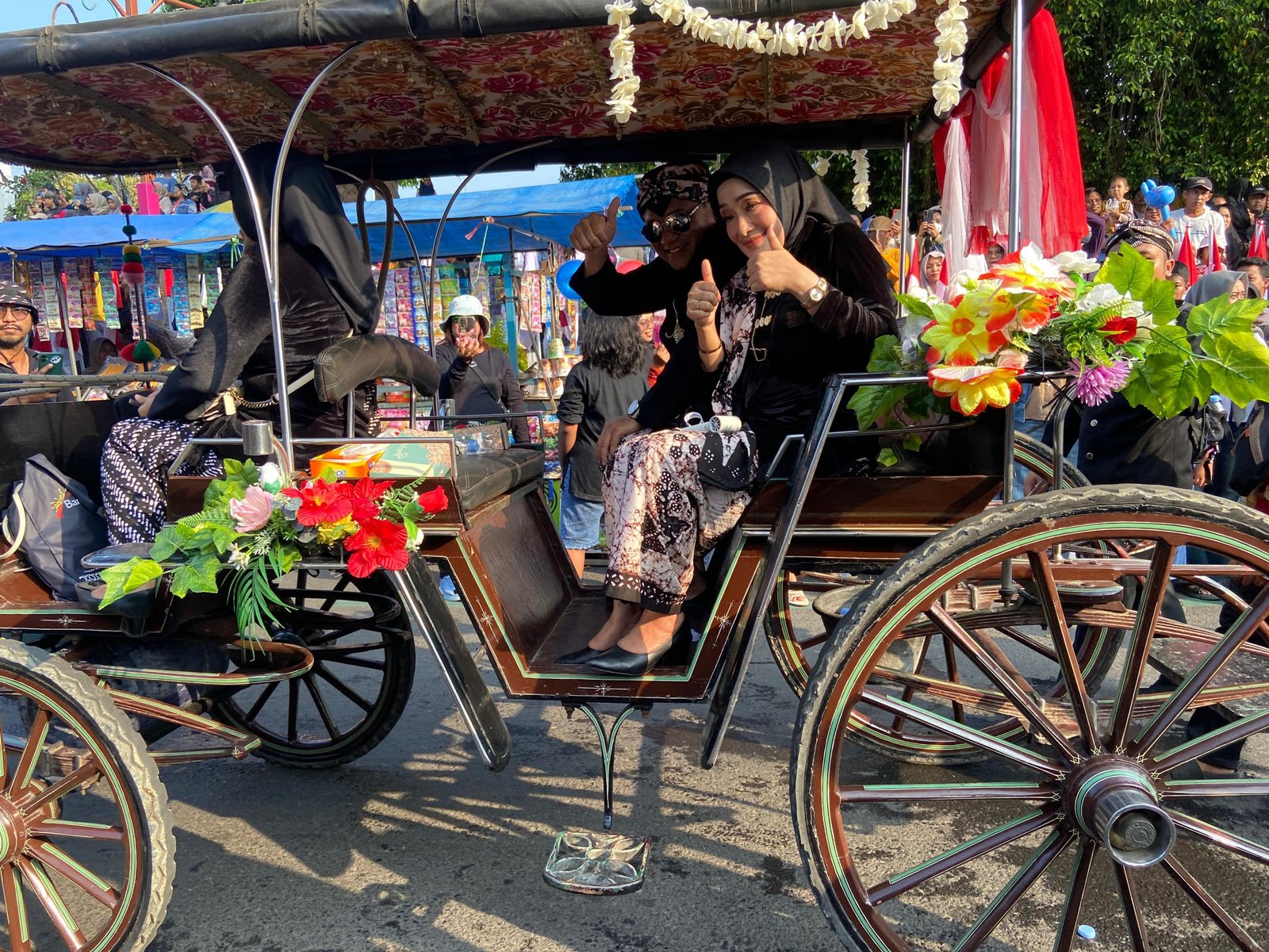 Bupati Pati H. Sudewo dan istrinya, Atik Kusdarwati, menjadi sorotan utama. Keduanya menaiki kereta kencana dengan balutan busana agung kanigaran. Mereka didampingi Wakil Bupati Risma Ardhi Chandra, jajaran Forkopimda, pimpinan DPRD, OPD, camat, serta tokoh masyarakat, pelajar, dan pegiat budaya.