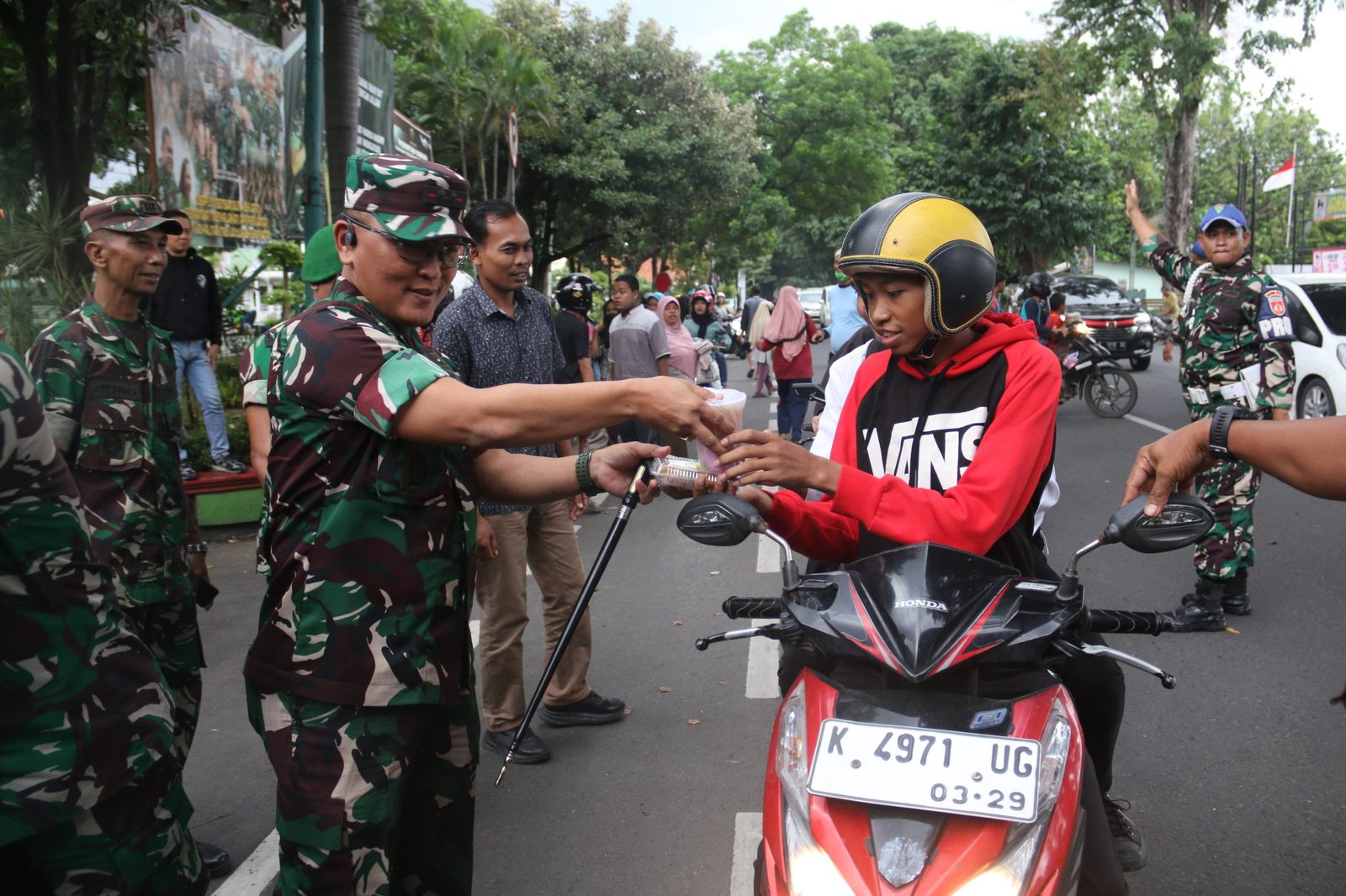 Pati, 7 Maret 2025 – Sebanyak ratusan takjil Ramadhan dibagikan oleh TNI dan Persatuan Istri Tentara (Persit) kepada masyarakat serta pengguna jalan yang melintas di depan Markas Komando Distrik Militer (Makodim) 0718/Pati. Kegiatan ini dipimpin langsung oleh Komandan Kodim (Dandim) 0718/Pati, Letkol Inf Jon Young Saragi, S.Sos., M.I.P., bersama Ketua Persit Kartika Chandra Kirana (KCK) Cabang XXXIX Dim 0718, Ny. Silvia Jon Young Saragi, pada Jumat (07/03/2025).